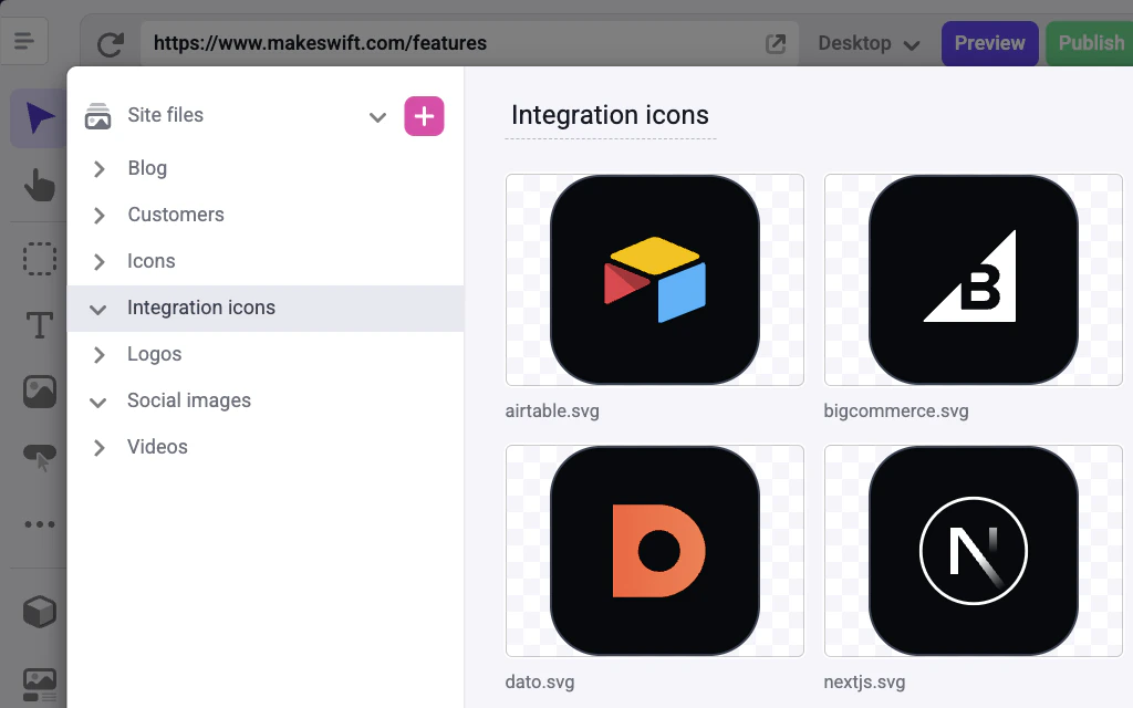 Clicking “Choose” opens the Makeswift files manager, where you can upload an image or select an existing one from your media library.